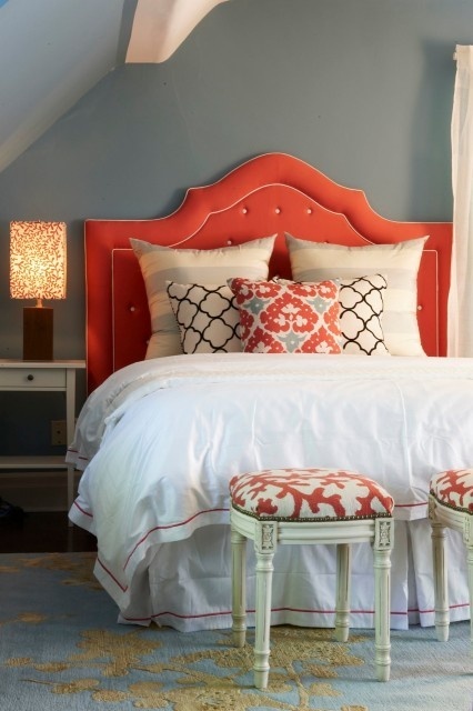 I learned the hard way, when decorating my bedroom in Hilton Head, to always start with the headboard. I had originally picked out everything else and then couldn't find a headboard that looked good. The end result was that I fell in love with a headboard that didn't go with anything and had to completely start over (thank god I kept receipts!) It was significantly easier to choose the other furniture and accessories once the headboard--or the centerpiece of the room--had been settled. I chose a distressed wooden headboard, but I'm also really into fabric covered ones right now. These are some of my favorite variations on fabric headboards.